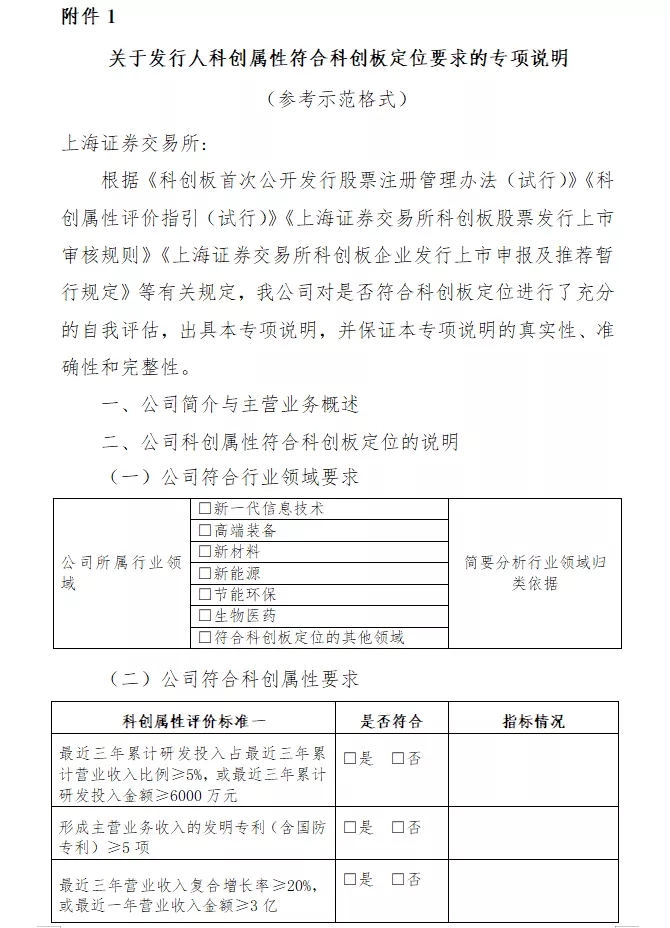 在《暫行規(guī)定》中,“關(guān)于發(fā)行人科創(chuàng)屬性符合科創(chuàng)板定位要求的專項說明”、“關(guān)于發(fā)行人科創(chuàng)屬性符合科創(chuàng)板定位要求的專項意見”兩個附件格外引人注意。在提供“考卷”的大綱之外,上交所還貼心地附上了標(biāo)準(zhǔn)答案作為參考示范。