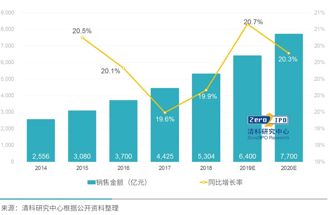 隨著醫療器械政策環境持續改善,國產自主創新器械不斷問世,資本助力行業加快兼并重組,中國醫療器械市場規模持續增長。2014-2018年,中國醫療器械市場規模從2556億元持續增長至5304億元,五年間市場規模擴大了一倍,年均增長率約20.0%,按照20%的同比增長率估算,預計2020年中國醫療器械市場規模將達到7700億元。