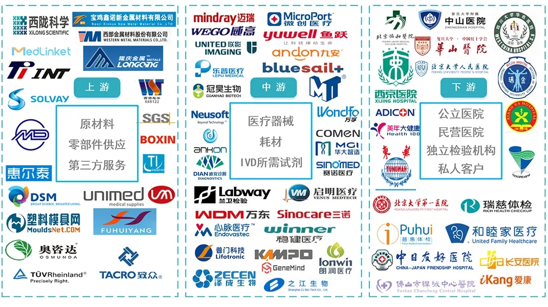 從醫療器械產業鏈來看:上游主要是醫療器械用原材料、零部件供應、第三方服務等;中游主要是醫療器械、耗材、IVD所需試劑等;下游主要是各類醫療機構,包括公立醫院、中小型民營醫院、獨立檢驗機構、私人客戶等。