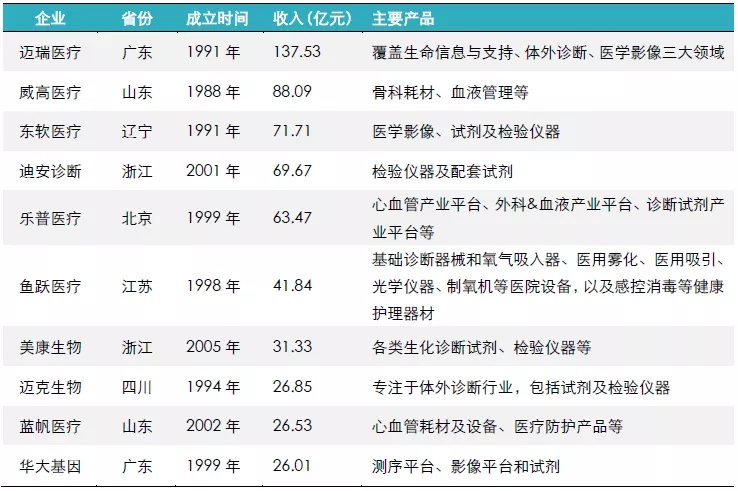 整體來看,中國發展活躍的醫療器械企業相對集中在東部沿海地區,平均成立時間一般超過20年,主要產品集中在體外診斷制劑及檢驗儀器、醫學影像等細分領域。根據公開數據,2018年,中國醫療器械企業TOP10總營收為583億元人民幣,占2018年中國醫療器械市場規模的11%,遠低于全球醫療器械市場44%的行業集中度。