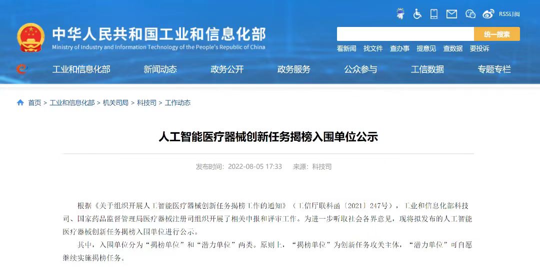 近日,國(guó)家工業(yè)和信息化部科技司、國(guó)家藥品監(jiān)督管理局醫(yī)療器械注冊(cè)司對(duì)人工智能醫(yī)療器械創(chuàng)新任務(wù)揭榜入圍單位進(jìn)行公示。