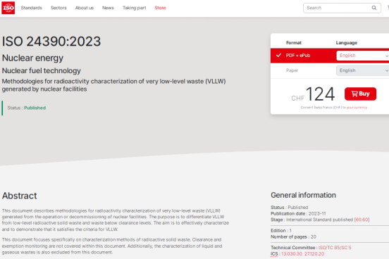 11月30日,由中輻院主導(dǎo)編制的國際標(biāo)準(zhǔn)ISO 24390:2023《核設(shè)施產(chǎn)生極低水平放射性廢物放射性表征方法學(xué)》正式發(fā)布,該標(biāo)準(zhǔn)是由我國在放射性廢物管理領(lǐng)域編制發(fā)布的首個ISO國際標(biāo)準(zhǔn),是中輻院高質(zhì)量發(fā)展和創(chuàng)建”國際一流”院所的又一重要成果,標(biāo)志著我國在放射性廢物治理領(lǐng)域的國際標(biāo)準(zhǔn)化工作取得重要突破